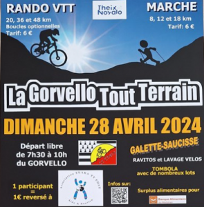 Le Club Cyclo Theixois organise la 11ème édition de sa randonnée Marche et VTT, LA GORVELLO TOUT TERRAIN le Dimanche 28 Avril prochain, à partir de 7H30, départ au village du Gorvello, THEIX-NOYALO Sont prévus : des ravitaillements sur les parcours, une galette saucisse à l'arrivée, ainsi qu'une loterie. 1 €uro par participant sera reversé à l'Association Elara Ty […]