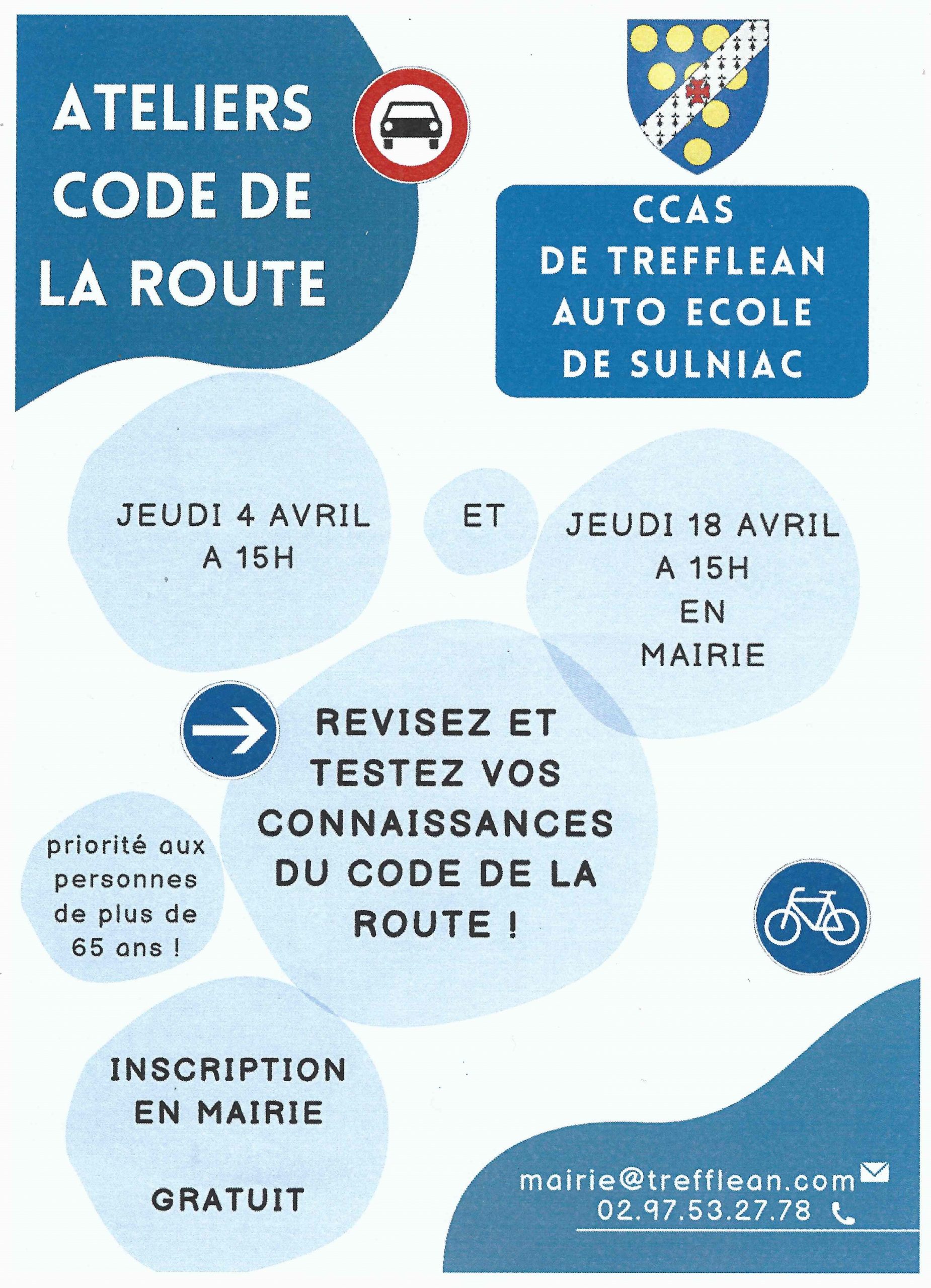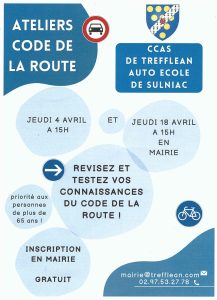 Accueil » Évènements » Atelier code de la route – CCAS TREFFLEAN « Tous les Évènements Cet évènement est passé Atelier code de la route – CCAS TREFFLEAN 18 avril 2024 - 15 h 00 min - 17 h 00 min « Marché Portes ouvertes – Inauguration fresque – Ecole Les Korrigans » + Google Agenda+ Exporter vers iCal Détails Date : 18 avril 2024 Heure : 15 h 00 min - 17 h 00 min Catégories d’évènement: divertissement, Sénior