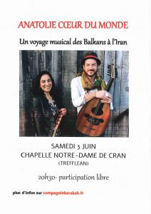 Accueil » Évènements » [CONCERT] 03/06 – ANATOLIE CŒUR DU MONDE « Tous les Évènements Cet évènement est passé [CONCERT] 03/06 – ANATOLIE CŒUR DU MONDE 3 juin 2023 - 20 h 30 min « [CONCERT] 27/05 – TIDIANE DIA – L’ESPRIT KORA Marché » + Google Agenda+ Exporter vers iCal Détails Date : 3 juin 2023 Heure : 20 h 30 min Organisateur Amis de la chapelle de Cran Lieu Cran