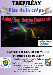 Accueil » Évènements » Fête de la crêpe « Tous les Évènements Cet évènement est passé Fête de la crêpe 3 février 2024 - 19 h 00 min - 4 février 2024 - 1 h 00 min « Marché Marché » + Google Agenda+ Exporter vers iCal Détails Début : 3 février 2024 - 19 h 00 min Fin : 4 février 2024 - 1 h 00 min Catégorie d’évènement: divertissement Organisateur Inter-association Lieu Complexe sportif Maurice Le Luherne Treffléan, 56250 France + Google Map
