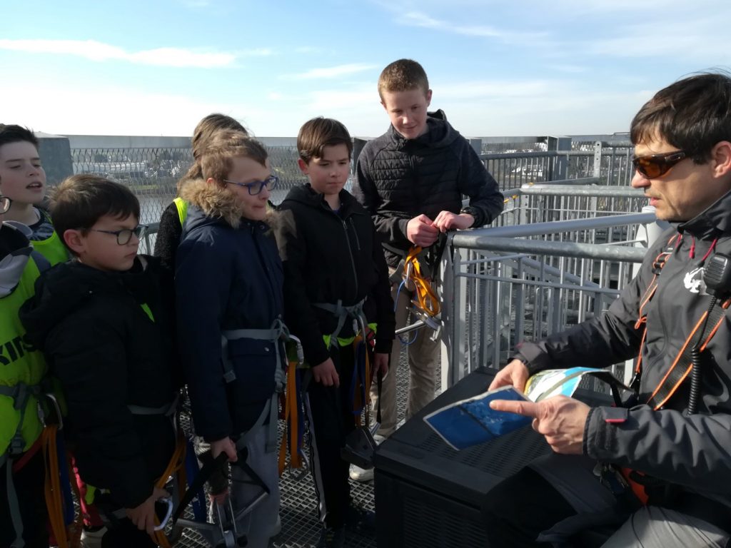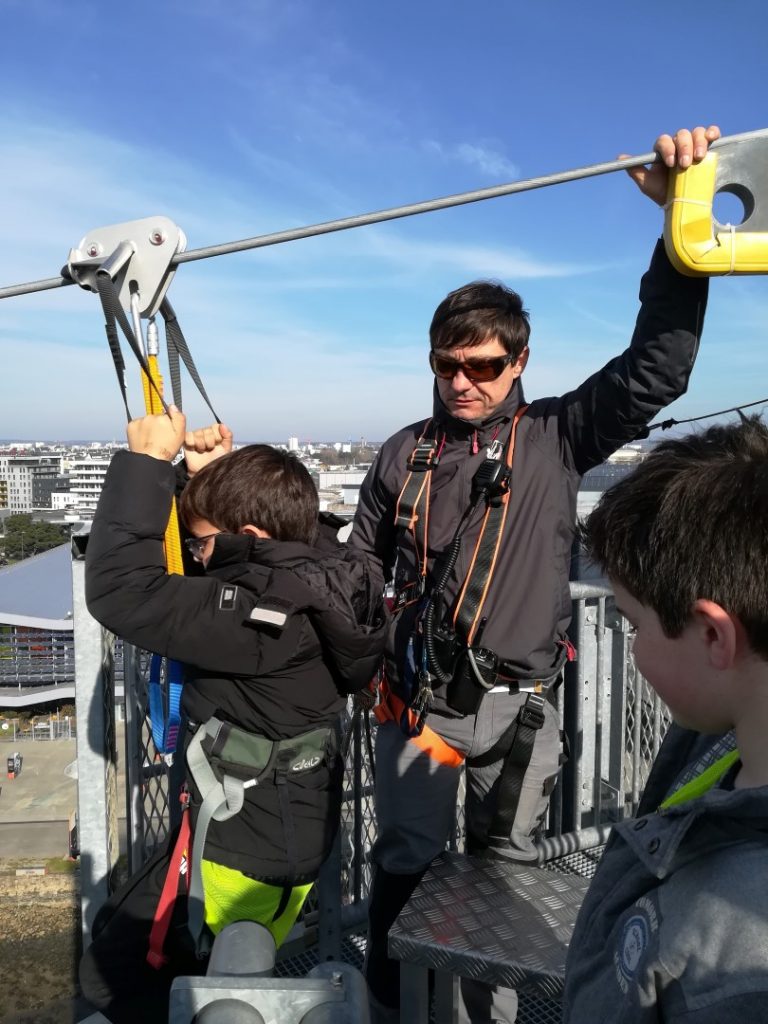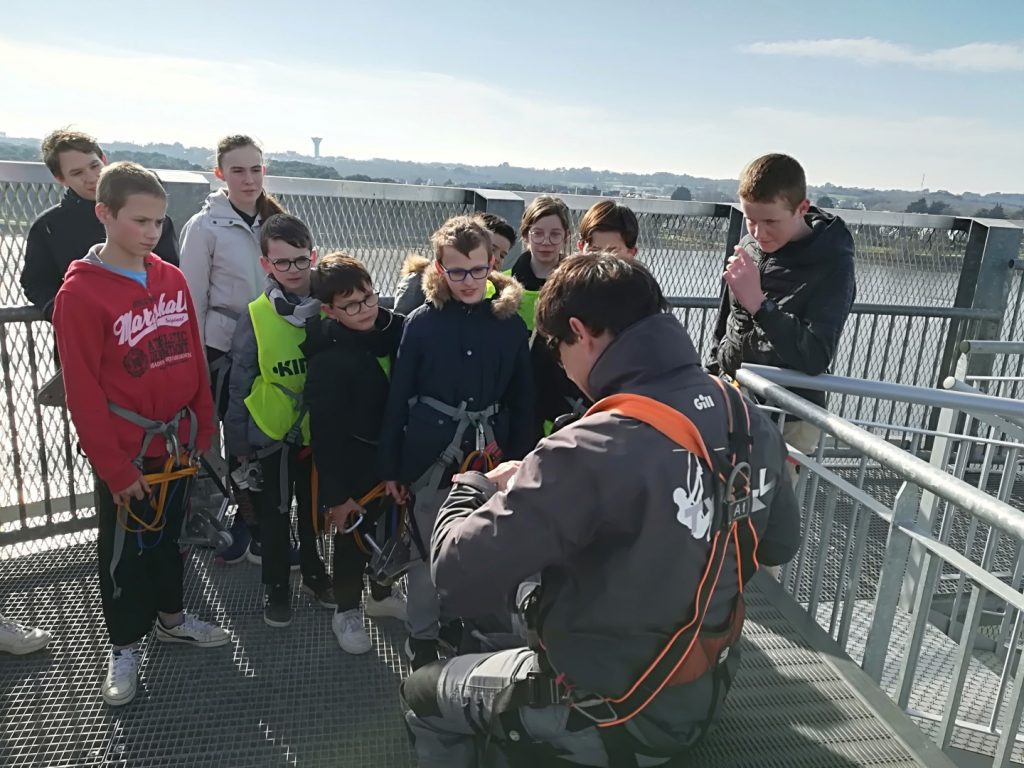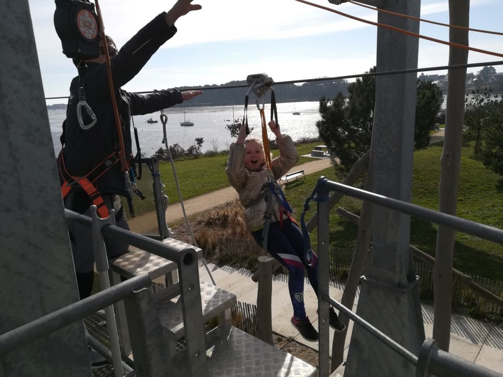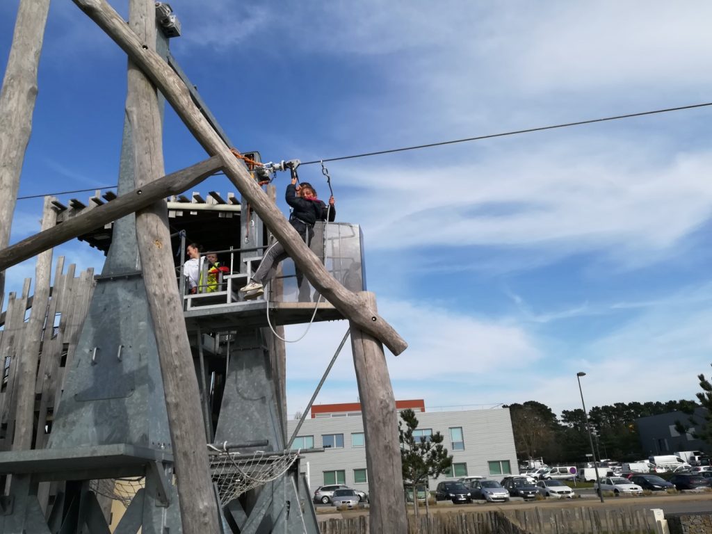 Après un pique-nique au soleil face à la mer de la rade de Lorient, les jeunes sont montés au sommet de la tour des Vents, haute de 38m (l’équivalent d’un immeuble de 30 étages), bénéficiant ainsi de sa vue panoramique exceptionnelle, avant un grand plongeon en tyrolienne au-dessus de l’eau à 60 km/h…sensations garanties pour ceux qui ont osés s’élancer !