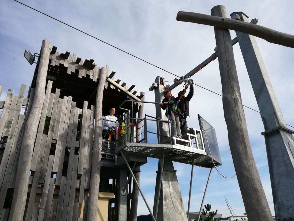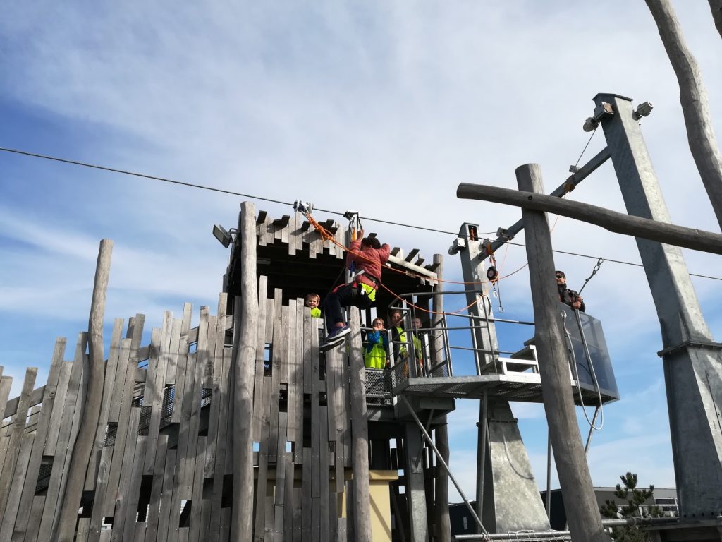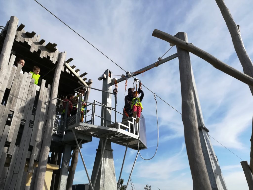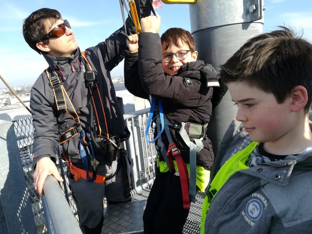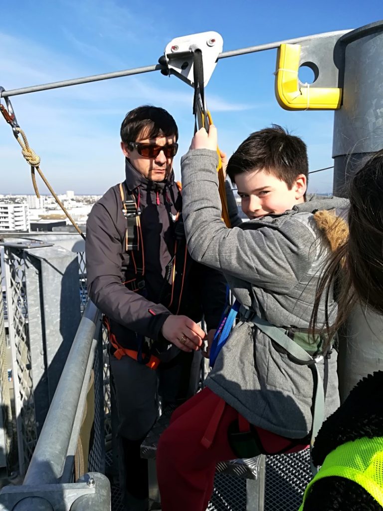 Après un pique-nique au soleil face à la mer de la rade de Lorient, les jeunes sont montés au sommet de la tour des Vents, haute de 38m (l’équivalent d’un immeuble de 30 étages), bénéficiant ainsi de sa vue panoramique exceptionnelle, avant un grand plongeon en tyrolienne au-dessus de l’eau à 60 km/h…sensations garanties pour ceux qui ont osés s’élancer !